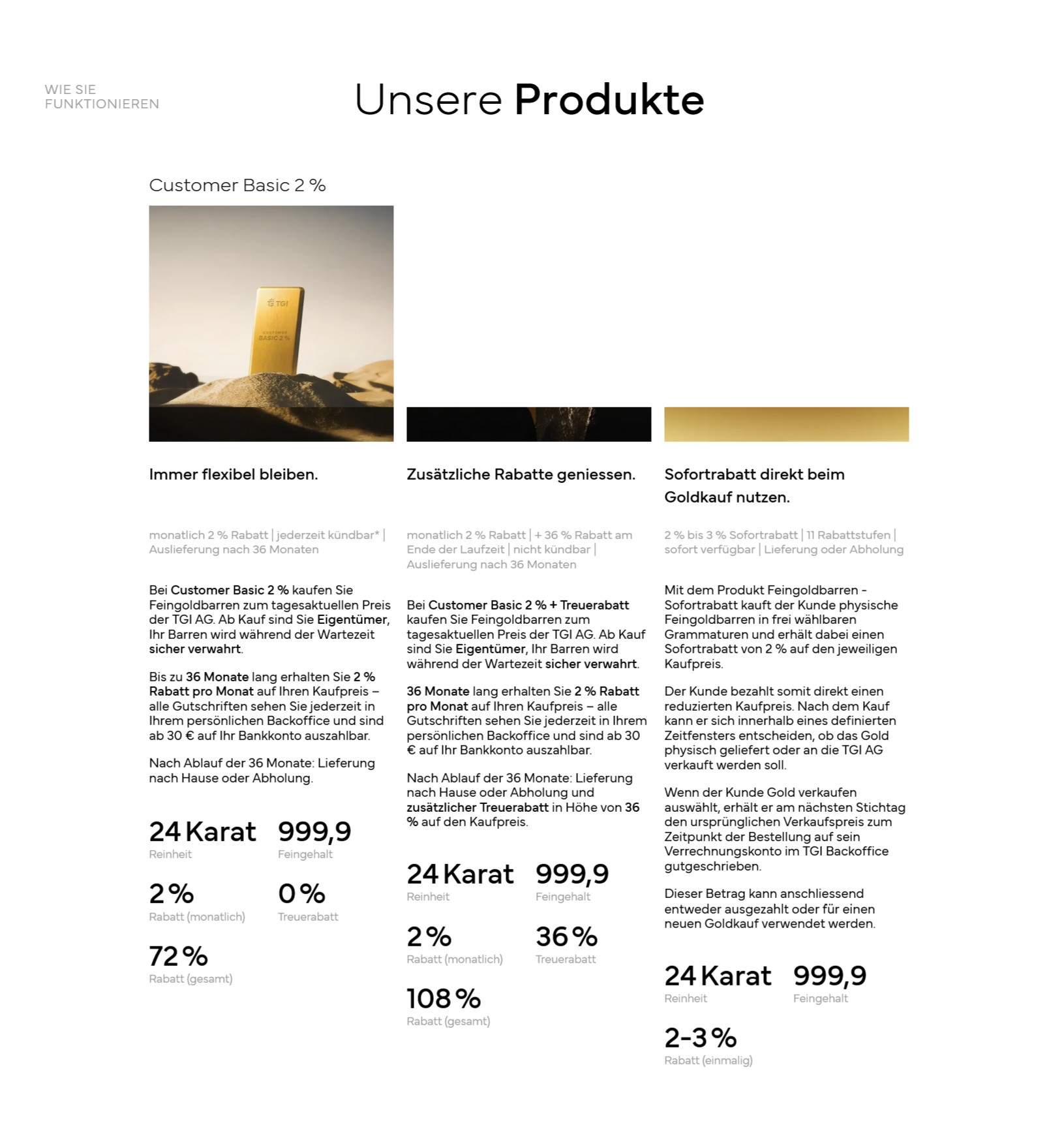 Ein Produkt klingt auf den ersten Blick simpel: physische Feingoldbarren kaufen, 2 Prozent Sofortrabatt erhalten und später entscheiden, ob das Gold geliefert oder an den Anbieter zurückverkauft werden soll. Genau mit diesem Modell wirbt die TGI AG nach vorliegenden Produktbeschreibungen für sogenannte „Feingoldbarren – Sofortrabatt“.